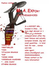 M.A.export clothes&shoes it is one of the most competitive suppliers company with three offices locations in Italy . Founded in 2002, our company offers items from liquidations ,shop returns and surplus stocks of the most famous fashion brands from around the world. We have always more than 1 million pieces of goods in our warehouse , in total look for man , woman and kids , with defects and without defects , that we sell separately , depending on the requirements of our clients. Our goal is to offer you the newest collections in terms of style, quality and models at best prices. Please consider our offerts , and let me know if you are interested in receive our offerts available now . Thank you very much !