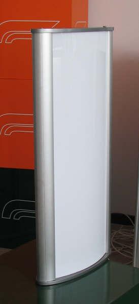 totem indoor cu fata curbata, iluminat sau neiluminat, simpla sau dubla fata, sistem click din profil de aluminiu anodizat, pot sta pe picior sau pot fi agatate de tavan, capace metalice, diverse dimensiuni