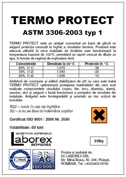 TERMO PROTECT este un antigel concentrat pe baza de glicoli ce asigura protectia crescuta la inghet a circuitelor termice. Produsul este adecvat utilizarii in orice instalatie de incalzire care functioneaza la temperatura maxima de 102 grade C, permitand un raport crescut de dilutie cu apa, in functie de regimul de exploatare dorit.