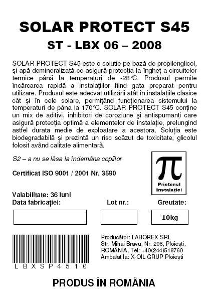SOLAR PROTECT S45 este o solutie pe baza de propilenglicol si apa demineralizata ce permite protectia la inghet a circuitelor termice pana la temperaturi de -28 grade C. Produsul permite incarcarea rapida a instalatiilor fiind gata preparat pentru utilizare. Temperaturile ridicate de pana la 170 grade C la care poate fi folosit il recomanda in aplicatii precum sistemele solare.