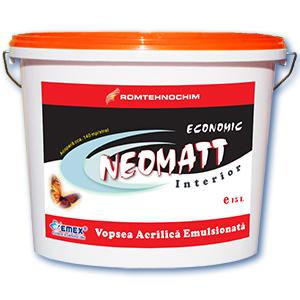 Vopseaua Lavabila Economica de Interior NEOMATT este un produs de dispersie, hidrosolubil, pe baza de polimeri acrilici de tip Latex, aditivi si fileri, pentru finisarea suprafetelor interioare, cu grad de alb ridicat, aderenta buna la suport si aspect mat. Acest tip de vopsea devine complet opac doar la cateva minute dupa aplicare si asigura o acoperire foarte buna, in conditiile unei corecte pregatiri a suportului. Desi foarte ieftin, produsul este eficient si usor de folosit. Produsul are posibilitati de colorare limitate la nuantele de baza ale cartelei de culori NCS.