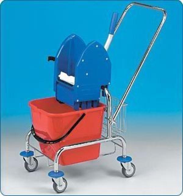 Carucior profesional pentru curatenie, inox, 1 x 17L, dotat cu: baza cu roti, maner, 1 galeata 17 litri, storcator profesional. Optional: cos inox,mopuri umede,raclete geam,spalatoare geam etc...