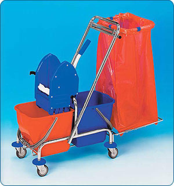 Carucior profesional, inox, pentru curatenie, dotat cu : baza cu roti, maner, 2 galeti X 17 L, storcator profesional, suport pentru sac 70 litri. Optional poate fi echipat cu tava (suport) pentru mop linear sau cu cosuri de inox pentru depozitare scule, ustensile de curatenie (detergenti, lavete, razatori pentru geam, etc.)
