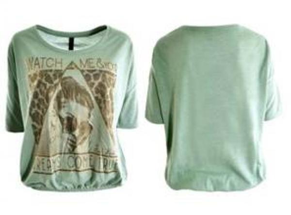 Model: Bluza sport cu maneca scurta, pentru femei si adolescente, cu tivul incretit in partea de jos si print de imagini si text pe partea din fata. Este realizata din vascoza in proportie de 33% si poliester 67%. Se ragaseste in culorile: roz pal, gri, maro si alb. Marimile variaza de la S la XL. Pretul: -24 bucati/ 4,50 euro per bucata; 96 bucati/ 4,20 euro per bucata. O oferta completa ce include intreaga gama de bluze comercializate va poate fi trimisa la cerere.