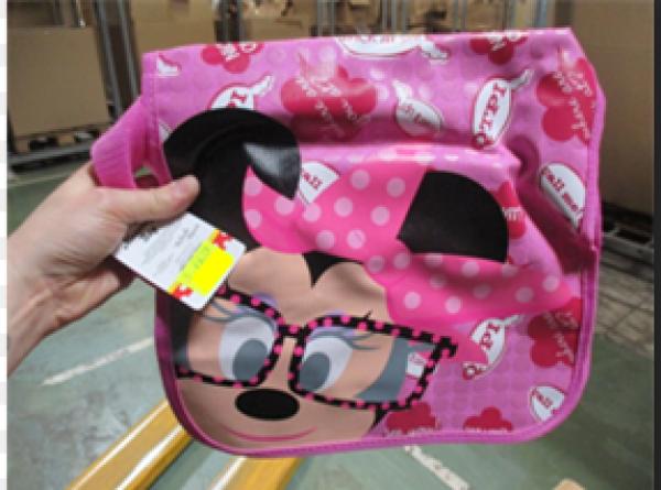 - Geanta Minnie Mouse, dimensiune 32x23x8 cm, stoc disponibil 468 de bucati, minimul de vanzare este de 150 de bucati. Pret 1.23 euro/buc.