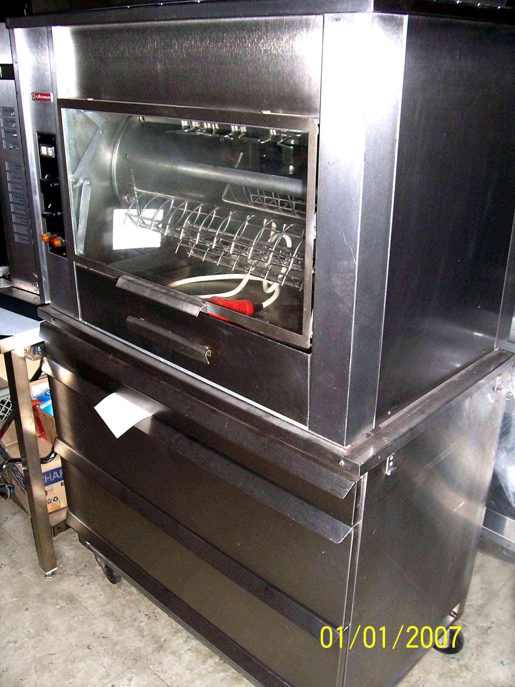 Vind rotisor pui marca ELOMA calitate germana ,cu 5 brate pt. 20 pui ,tensiune de conectare 380v~ 8,4 kw ,Dotare completa cu brate pt. fripturi pulpe cu cosuri stringere,iluminare interioara ,reglaj temperatura si turatie oprire rotatie la deschiderea usi tava scurgere , dulap cu sertare pt. pregatire pui cu orificii ingrediente . Pret 3200€ neg. pret nou catalog 6900€