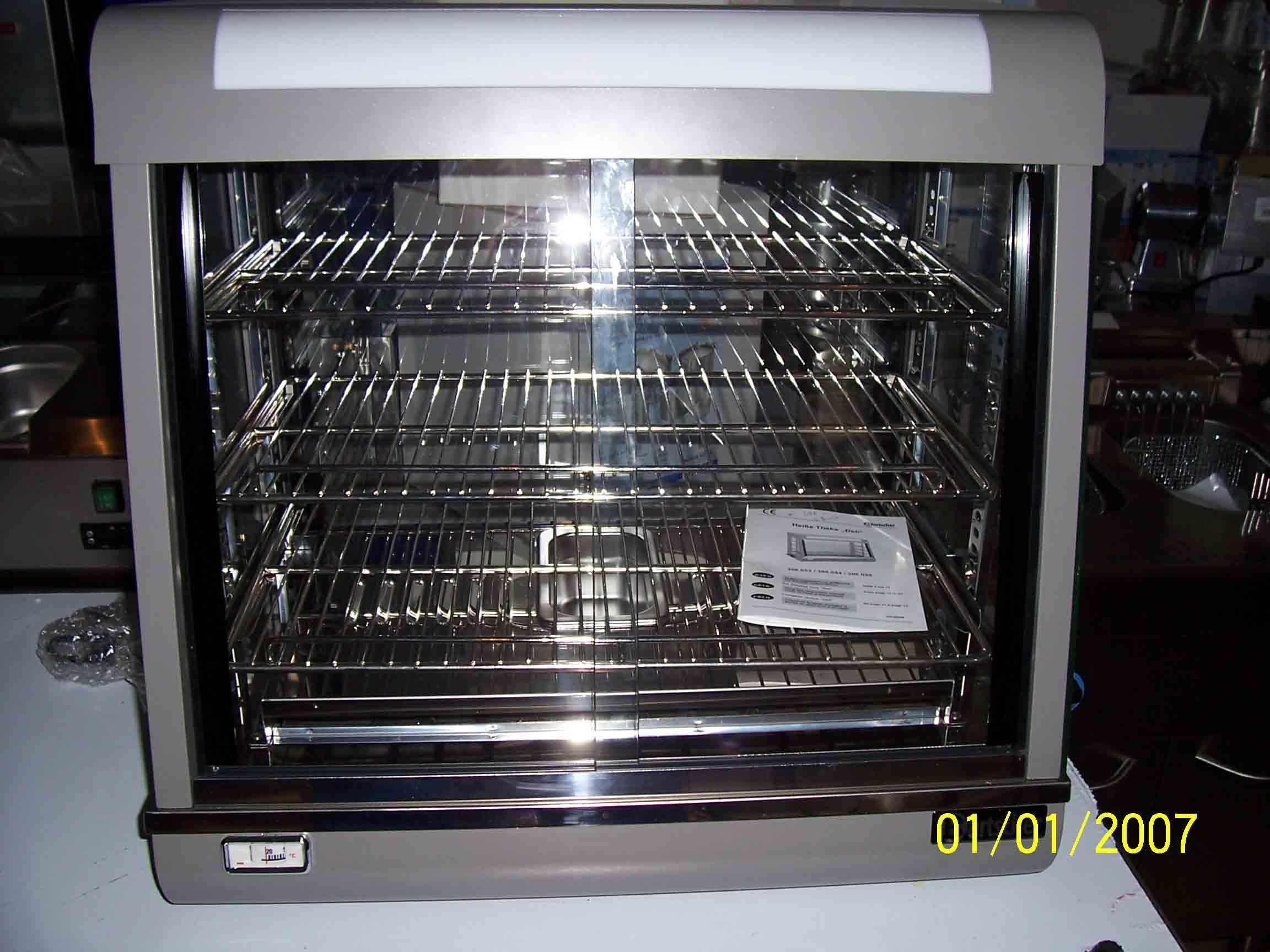Vind vitrina calda ideal pt. Fast Food cu 3 rafturi cu iluminaresi reglaj temperatura bprin termostat tava pt.apa cu umiditate. Interior inox,exterior vopsit argintiu. Marime 660x 437x655 Temperatura intre 30 si 90 grade plus.